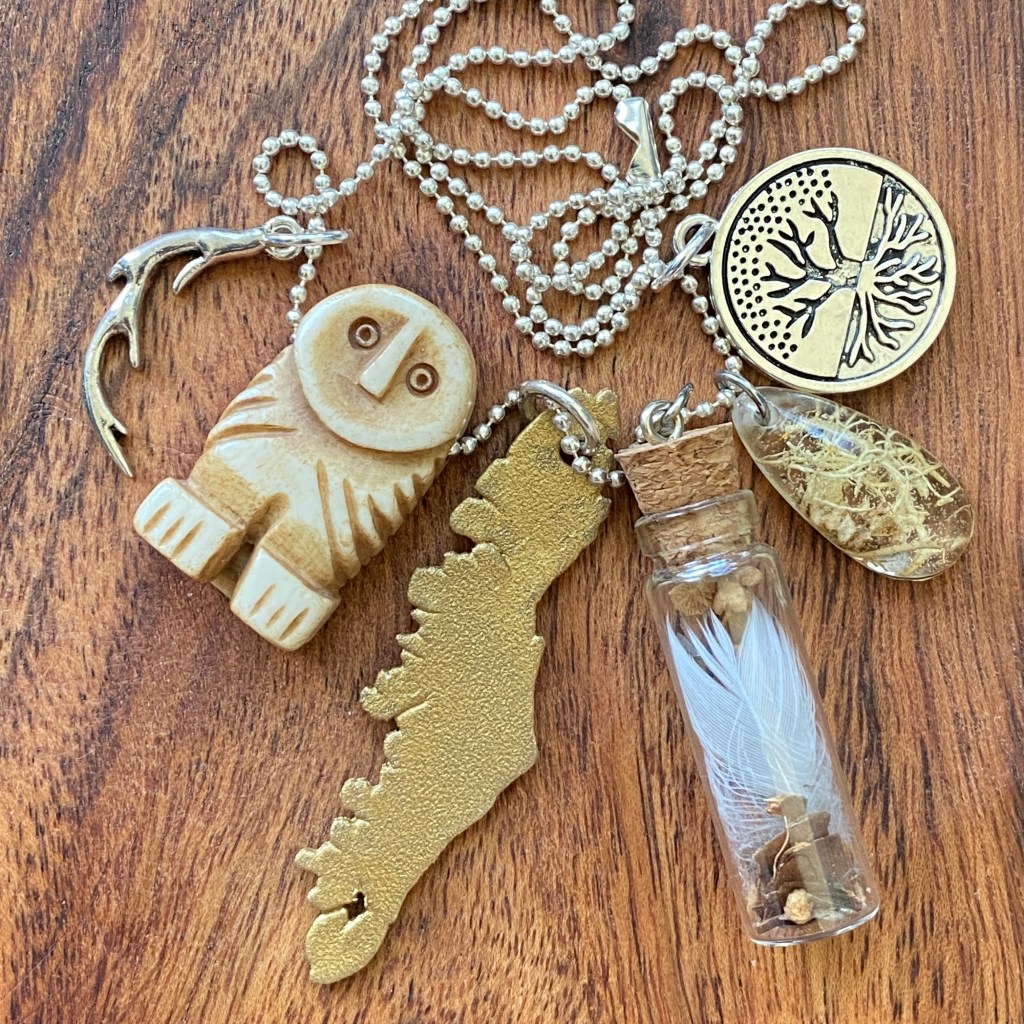 These pieces have a variation of things I have made and found such as lichen resin charms, maps of Vancouver Island, medicine bottles with owl feathers and dried mushrooms combined with charms of animals such as birds, bears, cougars and deers. These represent the wildlife found in my neighbourhood on Vancouver Island.