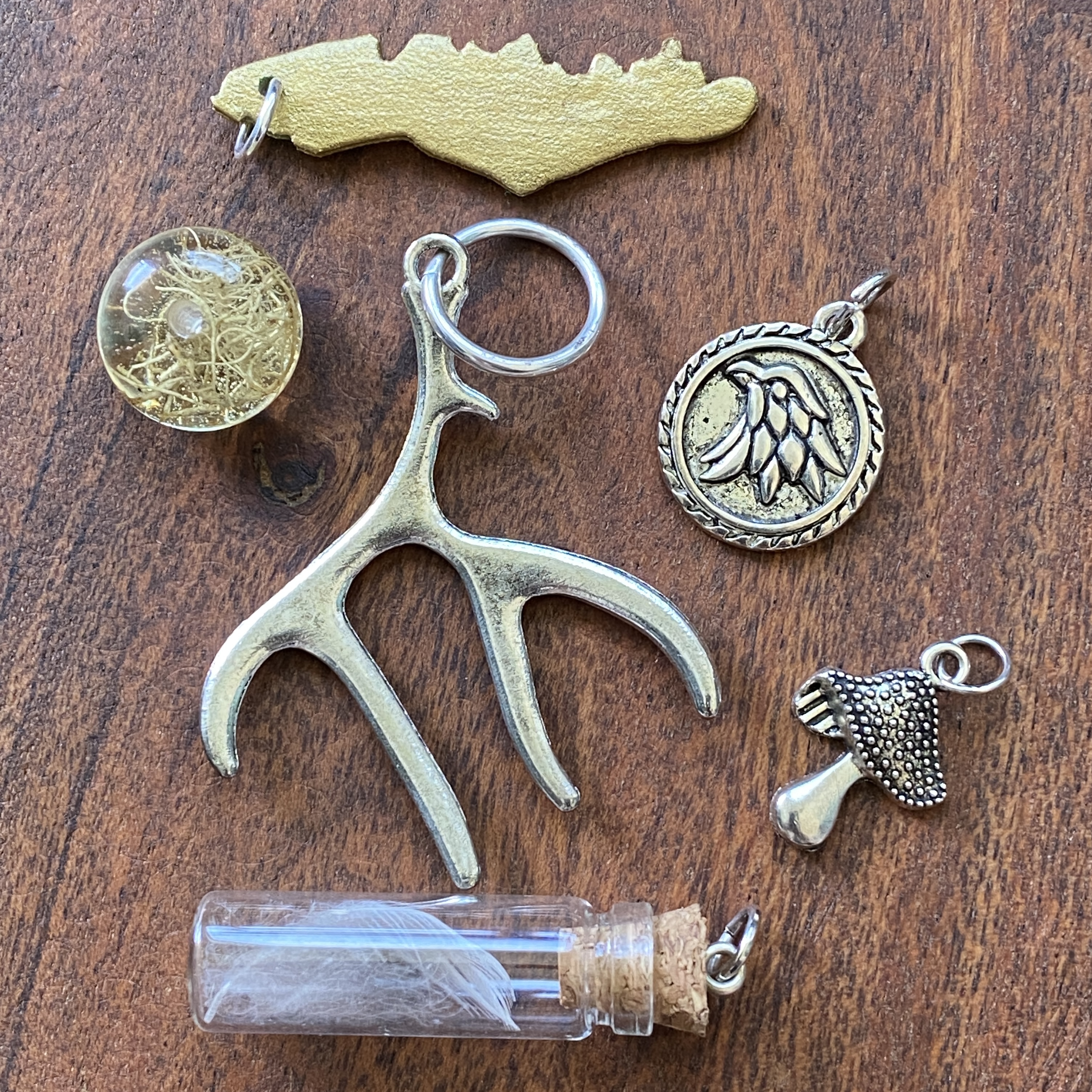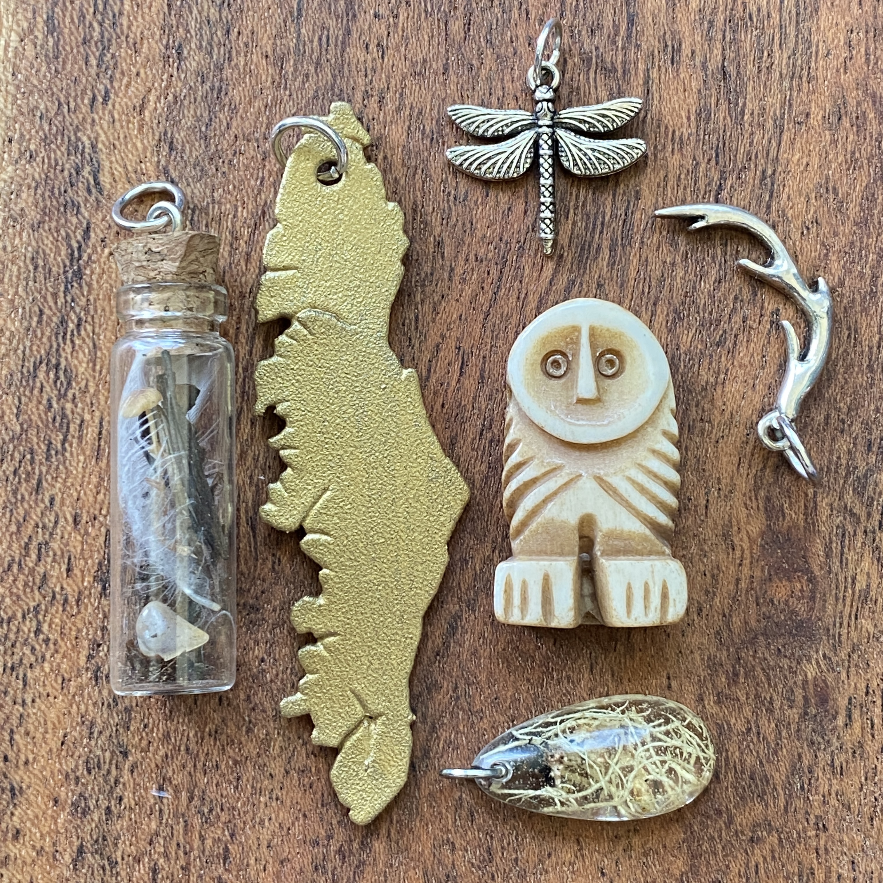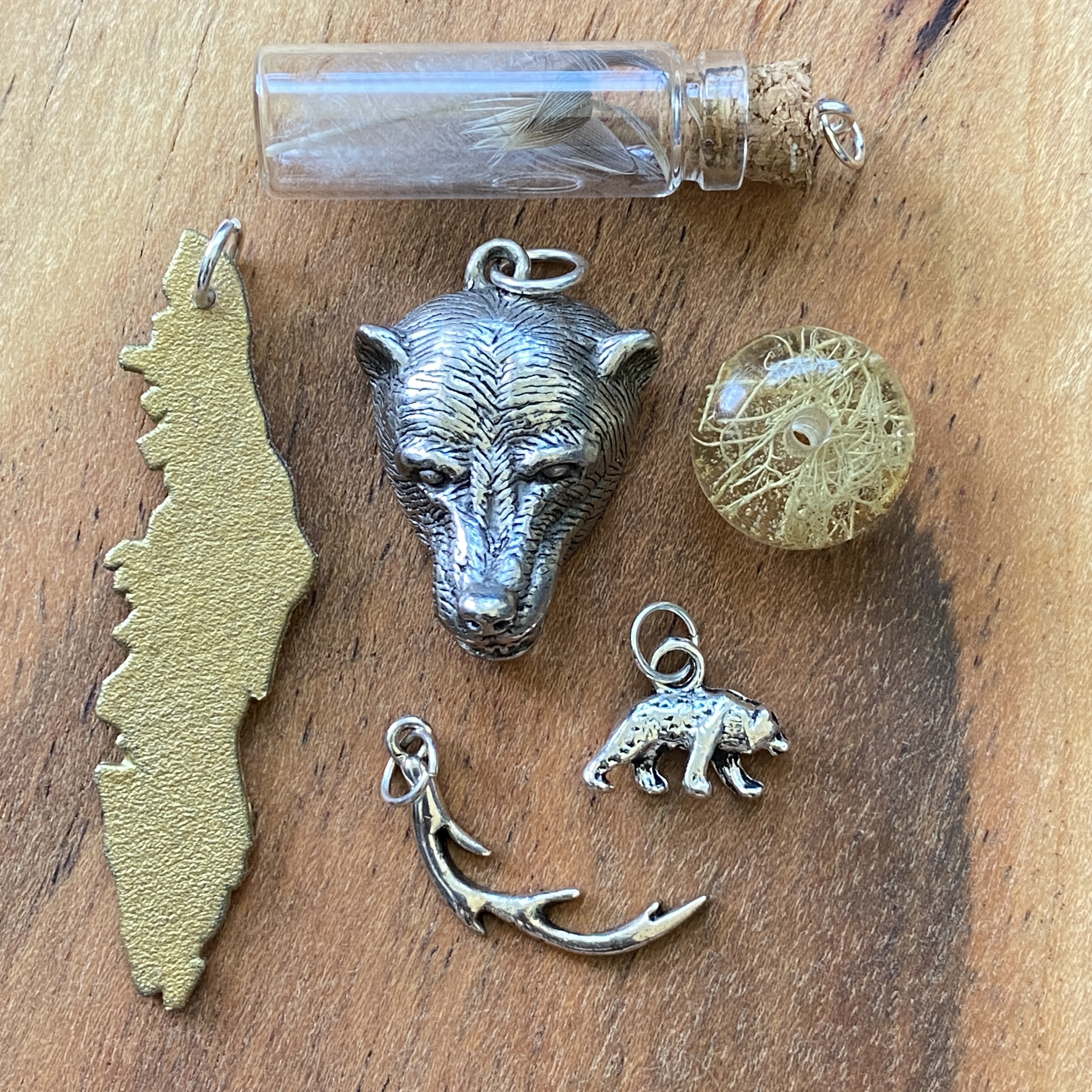 These pieces have a variation of things I have made and found such as lichen resin charms, maps of Vancouver Island, medicine bottles with owl feathers and dried mushrooms combined with charms of animals such as birds, bears, cougars and deers. These represent the wildlife found in my neighbourhood on Vancouver Island.