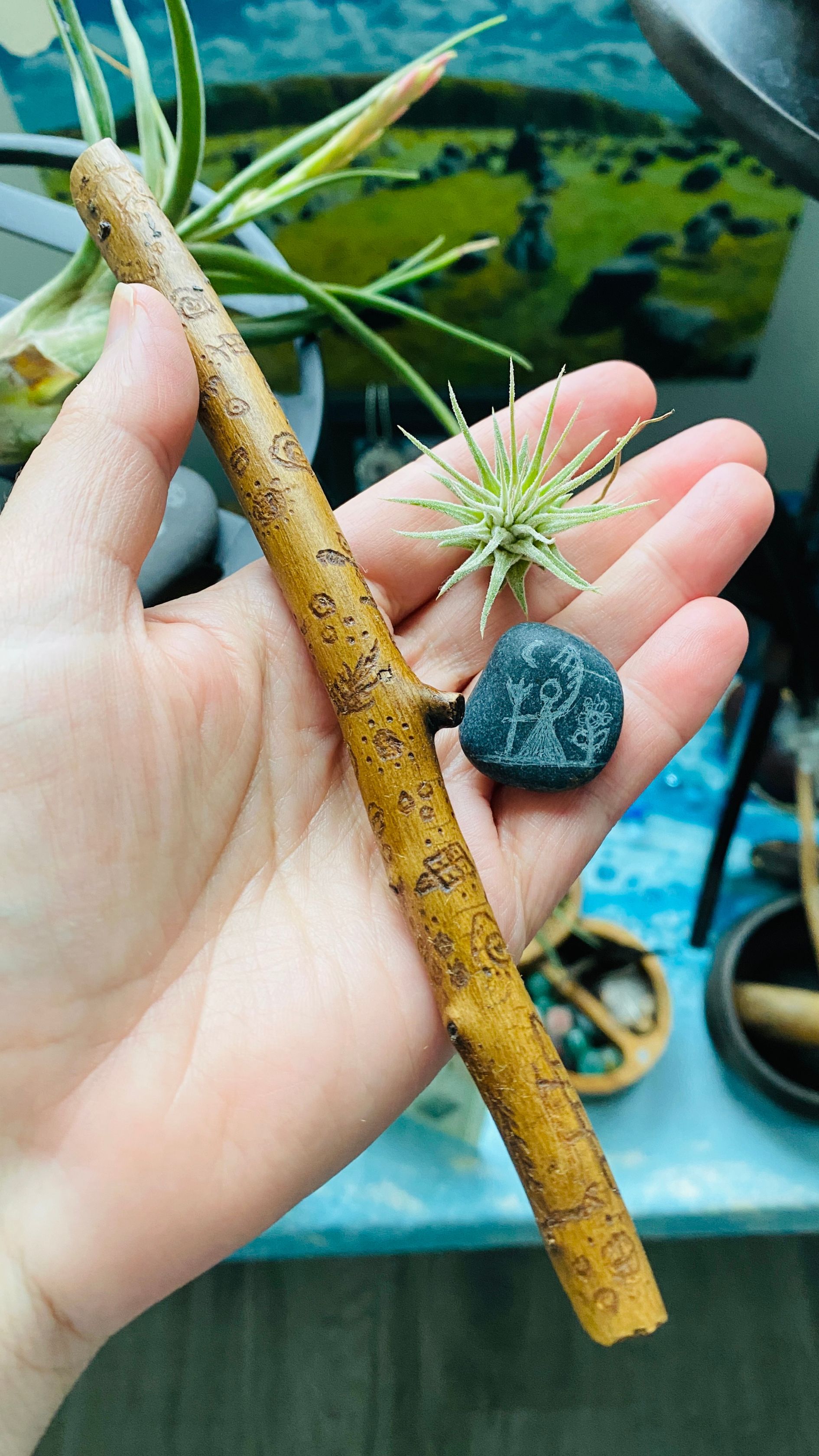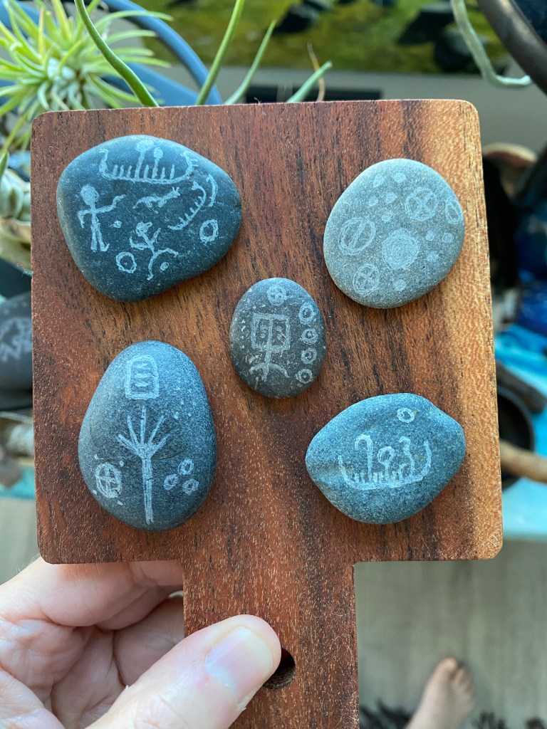 Just as I have done with sea glass and wood, I have also taken to basalt stone as a slate for engraving onto. I have engraved Nordic petroglyphs along with a few of my own creations. Sorry about the foot, it can end up in my photos at times 🙂