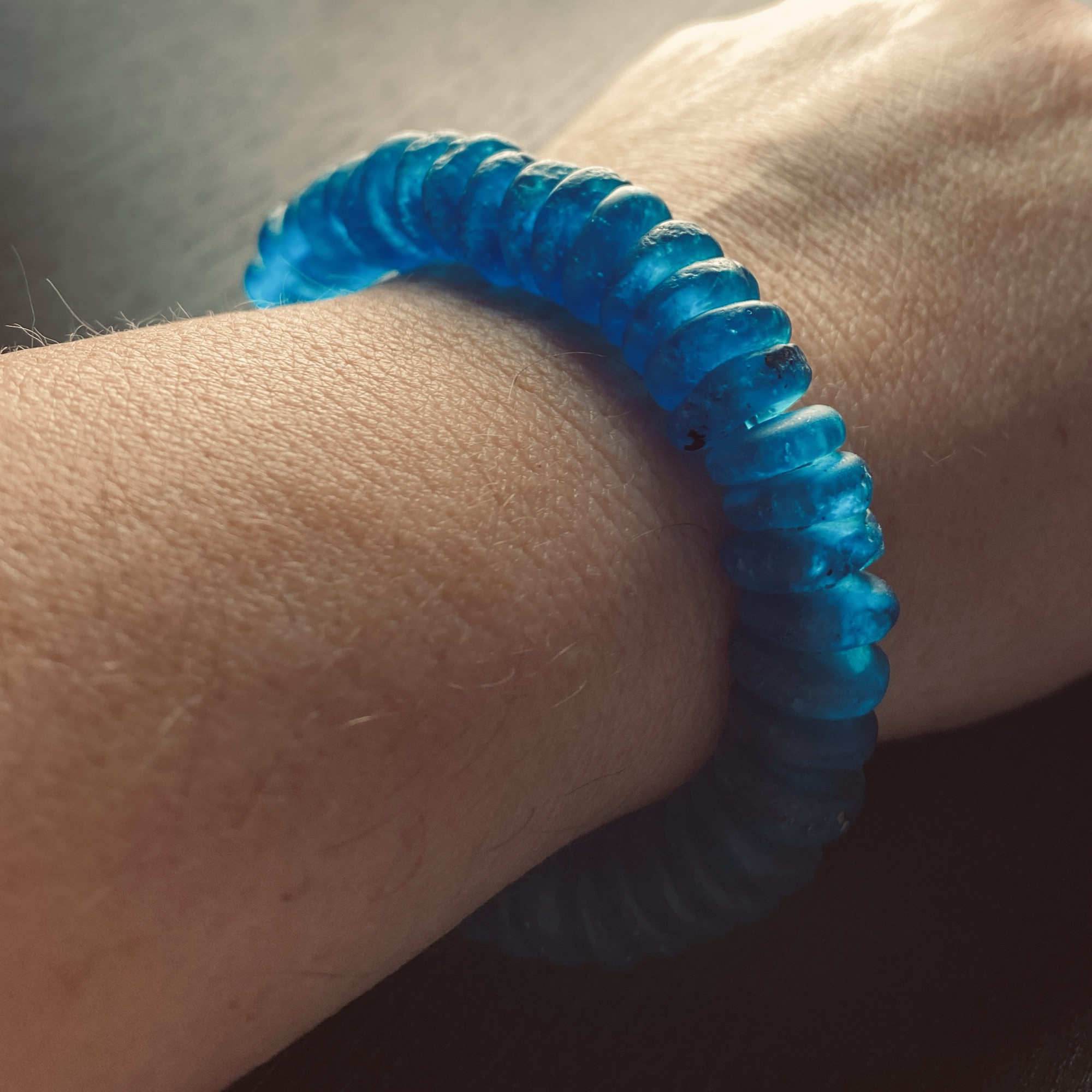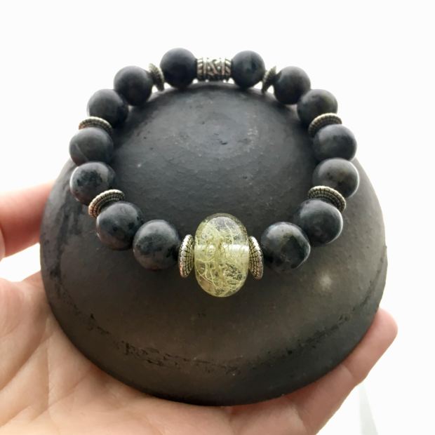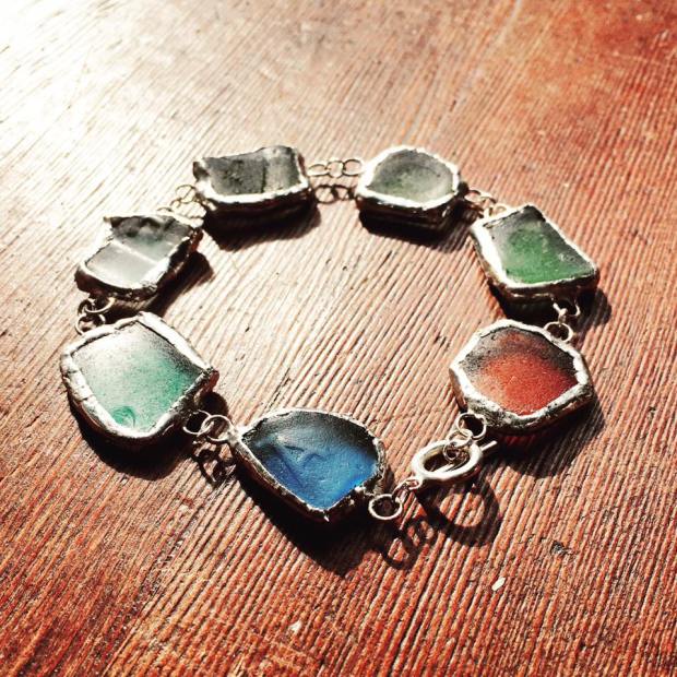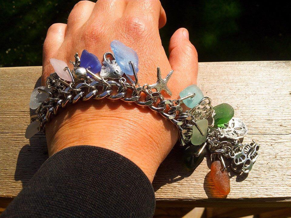 Bracelets made with Vancouver Island sea glass, gemstones, resin beads and charms. People wear their bracelets for meditation and fashion.