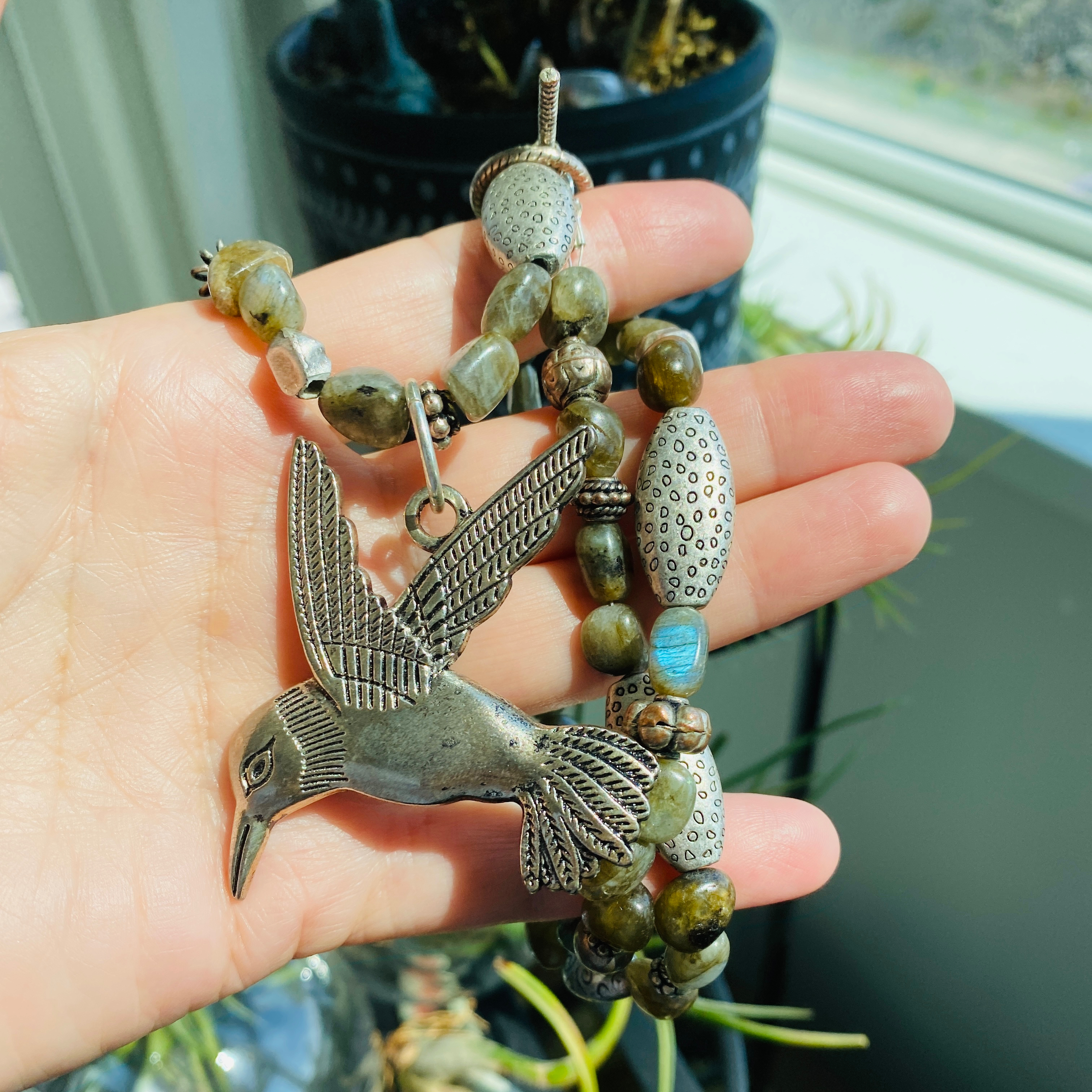 Necklaces made of sea glass, crystals, stones and charms worn for protection and or decoration. Themes are often Nordic and nature in style.