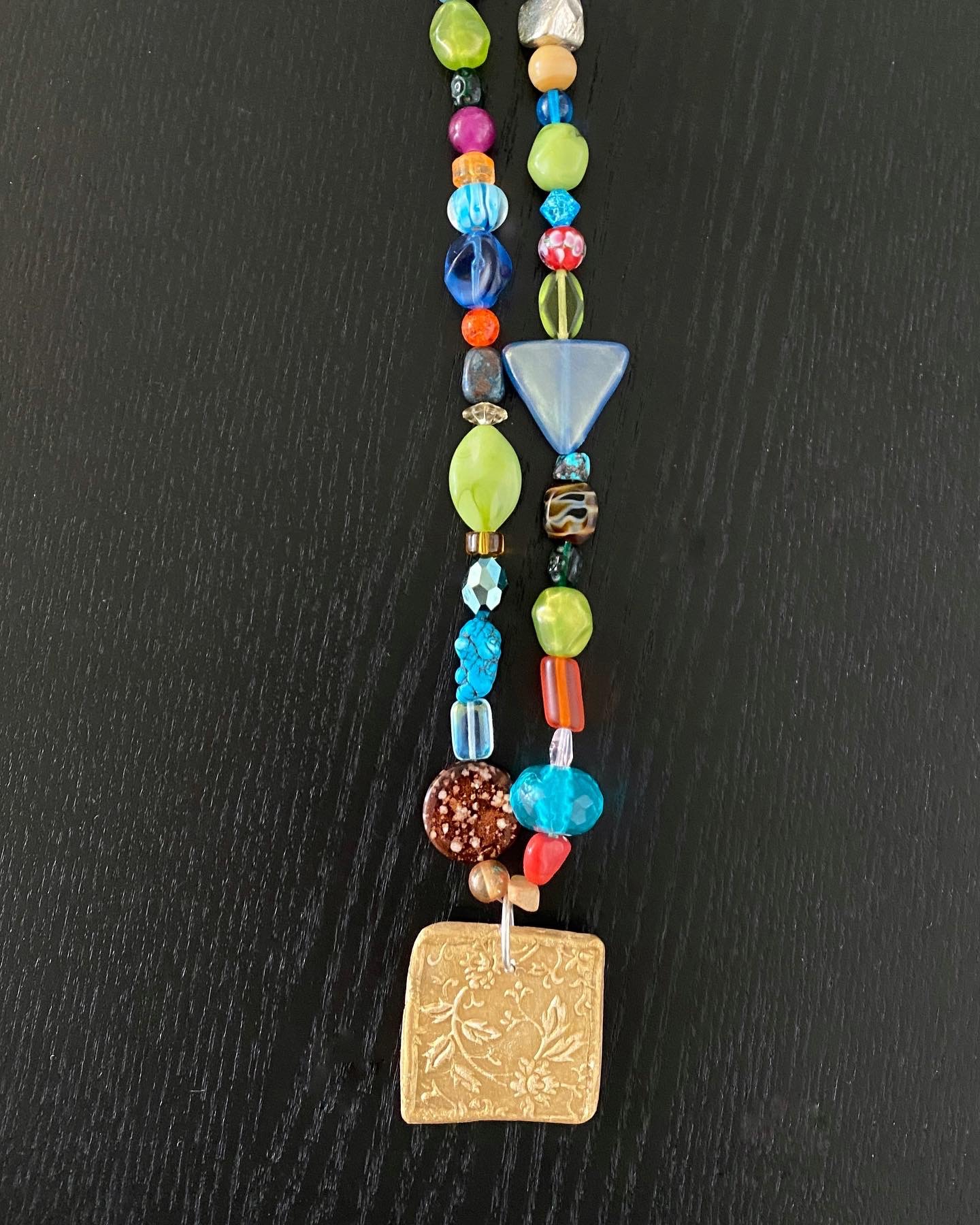 Chunky beads made from gemstones, glass, stones, resin, plastic, up-cycled fixings, featuring large pendants either made by me from polymer clay or metal. Meant to be bold and take centre stage around the nape of the neck or wrist. Inspired by museum pieces I have seen in Denmark.