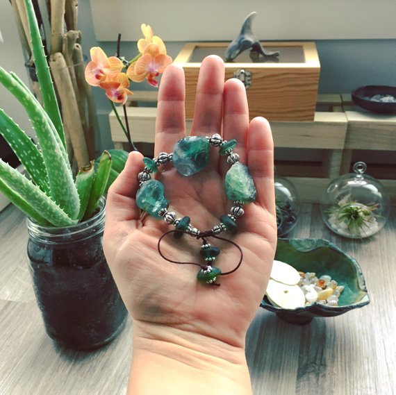 Chunky green Moroccan fluorite gemstones with seaglass found along the beaches of vancouver island accented with bohemian style beads. Adjustable nylon cord. Although this adjustable bracelet fits my 6.5 wrist, this can be adjusted for larger wrists also. Each sea glass bead was found and drilled by me. Fluorite represents all the chakras and helps with dizziness, anxiety and cleansing the astral body.