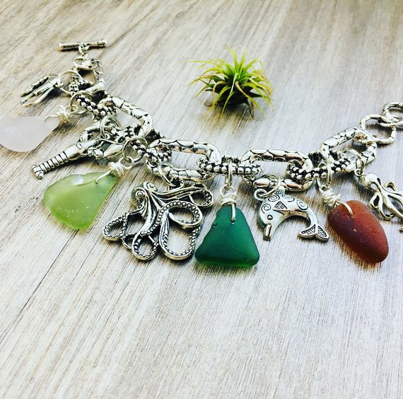Bulky, big and bold. This upcycled charm bracelet features marine themed charms and good sized west coast sea glass pendants, found, drilled and wire wrapped by me. Bracelet is 8” and expands to 9”. Perfectly fits my 7.5″ wrist.